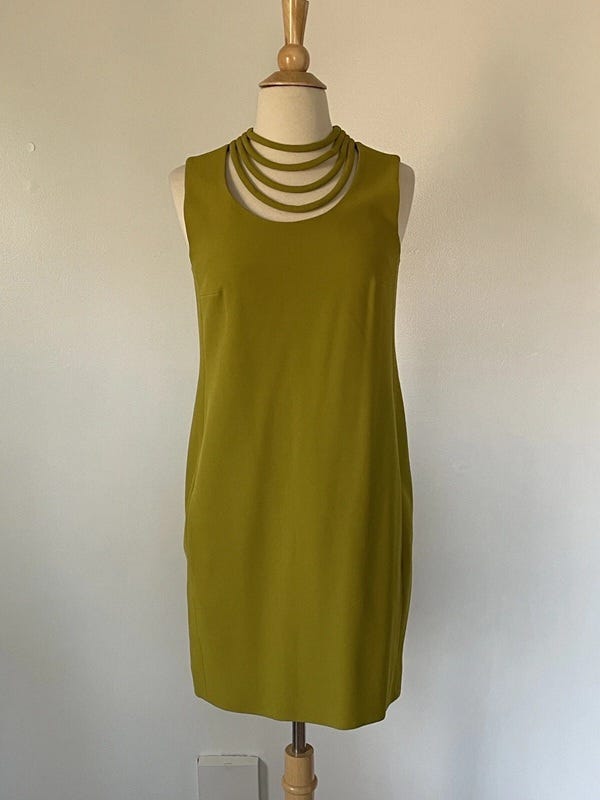And this simple yet stunning Diane Von Furstenberg chartreuse mini dress — 0, $38. The neckline has a sculptural, armor-like shape that almost resembles the plates of an arthropod exoskeleton.