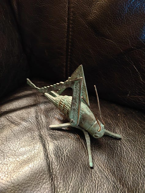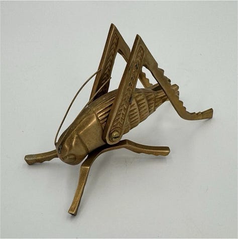 Search for “vintage brass grasshopper” or “cricket” and you’ll find a wealth of options, some in near-perfect condition, others with a soft patina earned over decades of good fortune. Besides being cute, they remind me of the lucky cricket in the Disney film Mulan.