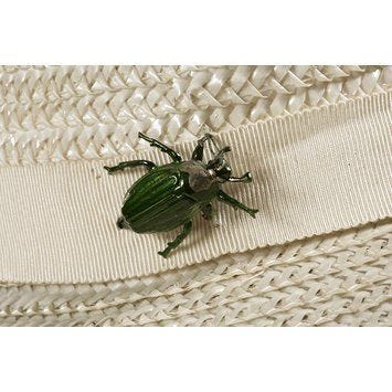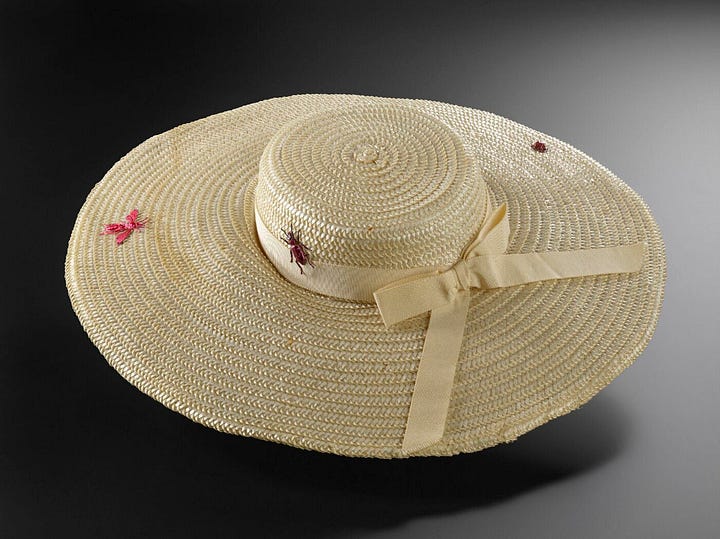 During my research for this article, I was drawn to the raffia, straw hats with bug pins adorned around the brim like the Schiaparelli hat below. And I just had to add one to my recently purchased Mariella Vilar rancher.